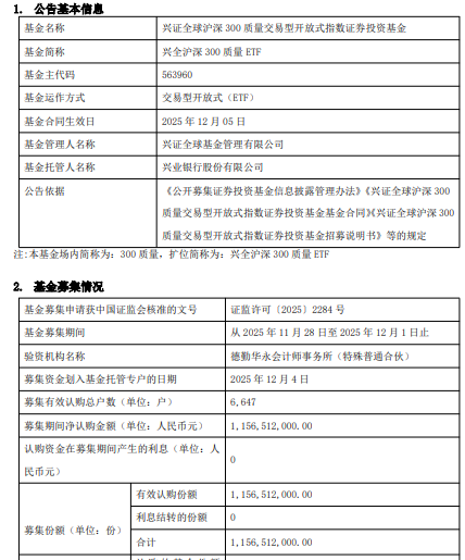 中国经济网北京12月8日电 近日,兴证环球基金发布关于兴证环球沪深300优质交易开放式指数证券投资基金基金合同有效性的公告。融资期内认购净额为1,156,512,000元,融资期内认购资金应计利息为0元,募集股份总数为1,156,512,000.00元。基金经理田大伟先生,曾任光大保诚基金管理有限公司绝对收益投资部总监、基金经理。同时担任资产管理部资产管理部副部长、资产管理部量化投资部副部长、华鑫证券股份有限公司投资经理、总经理、投资经理。现任兴业证券环球基金M专户投资部投资经理、基金经理。管理有限公司