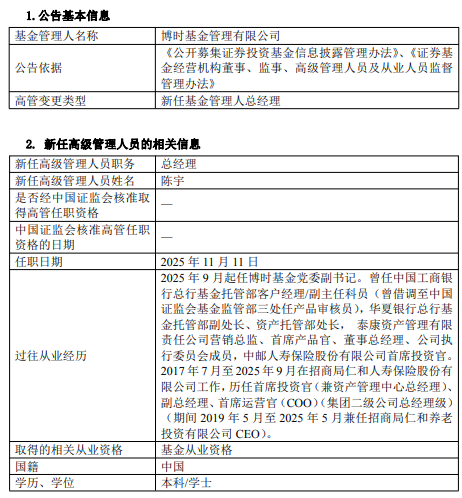 中国经济网北京11月12日电 今日,博士基金宣布任命陈宇先生为CEO。公告显示,陈宇先生将于2025年9月起担任星星基金党委副书记。曾任中国工商银行基金托管部客户经理、副秘书长(并借调至中国证监会基金监管部三处担任产品审核员)、基金托管部副主任、基金托管部经理。华夏总公司资产。曾任泰康资产管理股份有限公司银行家、营销总监、产品总经理、执行委员会委员等职。中邮人寿保险股份有限公司首席投资官。2017年7月至2025年9月就职于招商仁和人寿保险股份有限公司,历任首席投资官(兼资产管理中心总经理)、副总经理、首席运营官(COO)(集团二级总经理级)。分配)。 (同时,2019年5月至2025年5月担任招商仁和养老投资有限公司首席执行官。)